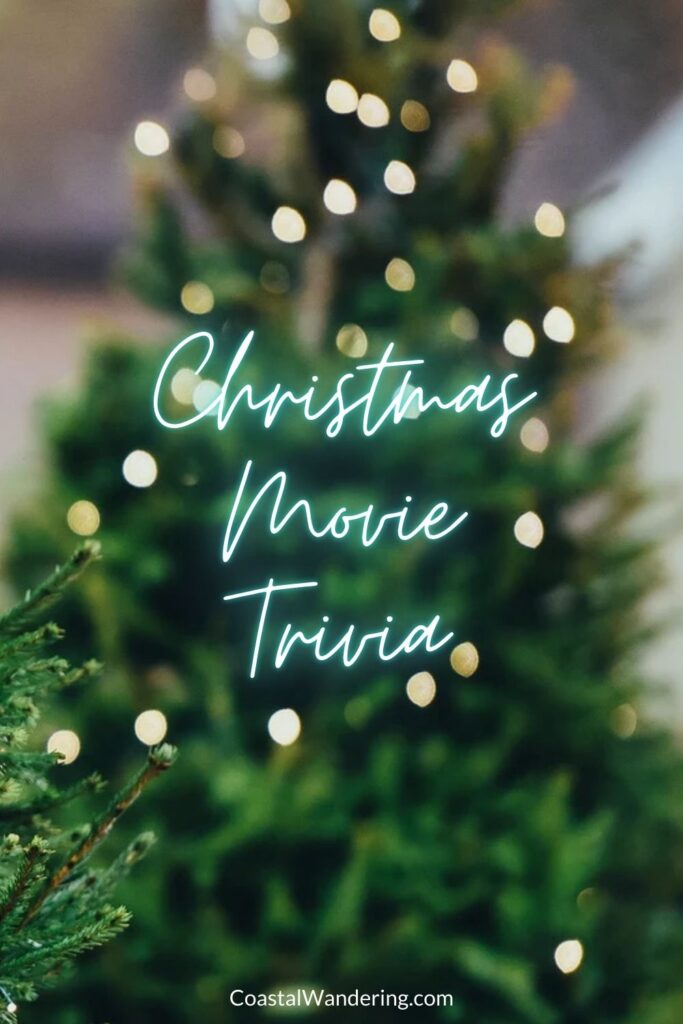 Christmas movie trivia in white script with Christmas tree with lights in background.